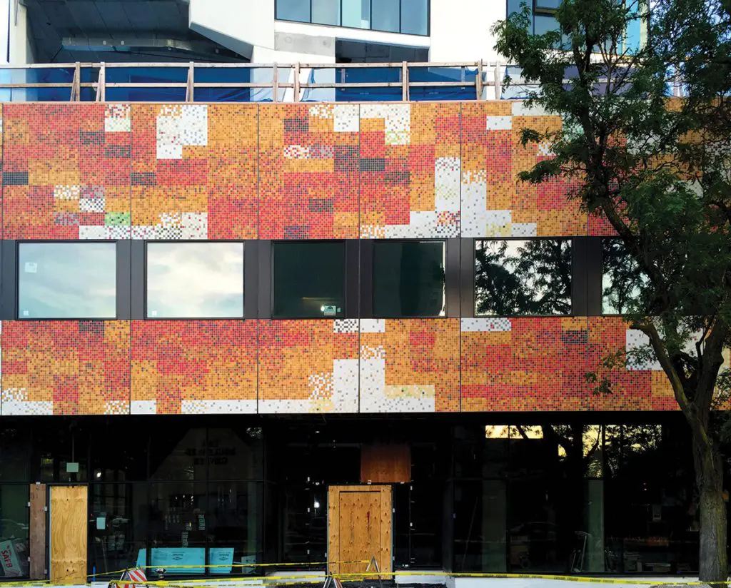 Architects designed the facade of the lower two-story retail portions of this Chicago residential midrise tower with a sophisticated tile mosaic that wraps around the building, interpreting the four seasons. Sto Panel Technology, Sto’s prefabricated exterior finished wall panels, proved to be an excellent choice to achieve the design vision of the project. The complex job required 20,660 ft2 of StoPanel® Backup with mosaic tile, StoPanel® Classic ci, and StoPanel Metal ci. The design also included punched windows to give the tower facade an appearance of ribbon windows.