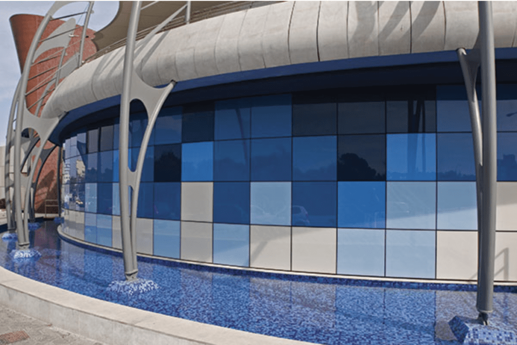 Built-in 2007, the bent facade of the Palma Aquarium gives the impression of a living organism. Architects accomplished this with StoVentec® Glass Rainscreen®, which allowed for custom sizes of the sweeping design. In addition, the non-visible StoVentro™ Agraffe profile permitted the attachment of glass-colored panels to the rear side, to create a visual flow of color and curve.