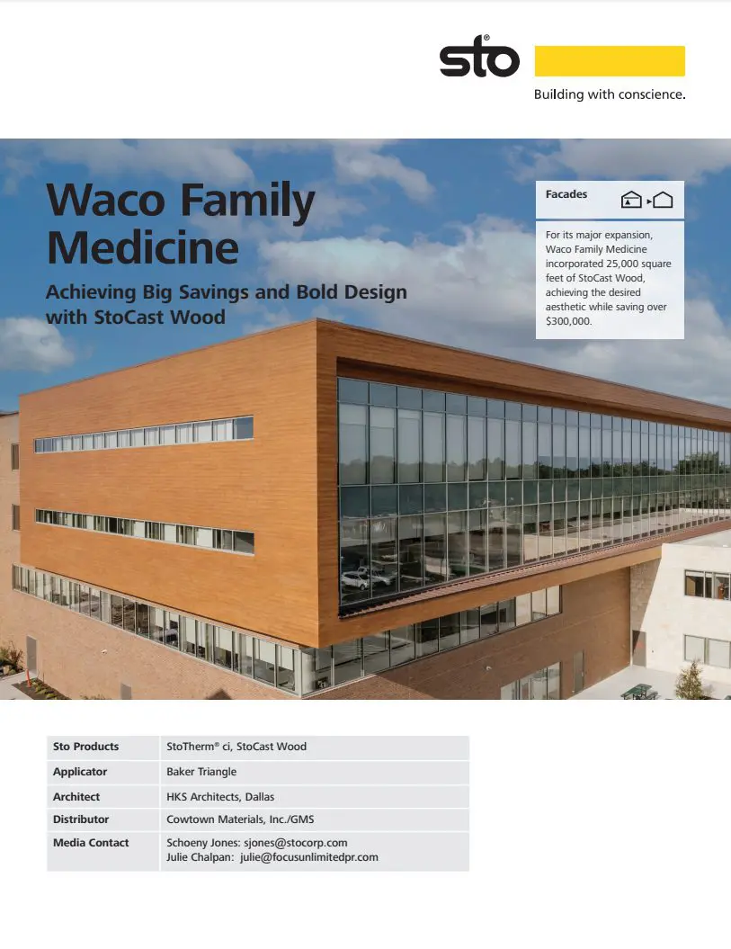 When Waco Family Medicine faced a costly expansion challenge, StoCast Wood offered a solution that redefined what was possible. Paired with the energy-efficient StoTherm® ci system, this solution delivered a stunning wood aesthetic, all under a single warranty—saving the client over $300,000.