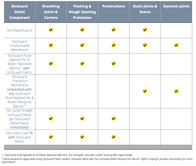 The StoGuard family of air and water-resistive barrier products includes impermeable liquid-applied membranes or vapor permeable air barriers, depending on the wall design and climate: Sto Gold Coat®, Sto AirSeal®, Sto ExtraSeal®, and Sto VaporSeal® – all work as quality water and air barriers when used with StoGuard® Detail Components a set of fully compatible accessories. These Detail Components are designed for use with StoGuard fluid-applied AWRB products at movement joints, substrate transitions, penetrations, transitions to roofing and below-grade air barriers, and rough openings.