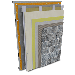 StoPanel® MVES ci is an engineered insulating wall system with Adhered Masonry Veneer (AMV) – thin brick, natural stone, ceramic tile, or cultured stone. It combines superior air and weather tightness with excellent thermal performance and durability. It incorporates continuous exterior insulation and a continuous air/moisture barrier with Sto high strength masonry veneer adhesive.