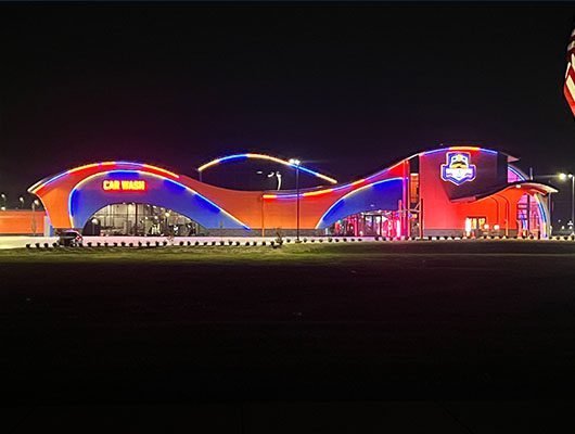 Inspired by the curves and motion of a Hot Wheels track, this vibrant car wash combines design flair with technical precision. The crew used StoTherm® ci with Stolit® 1.0, StoColor® Acryl Plus Eggshell, and Sto Clear Coat Sealer to achieve bold orange and blue radii formed from 8-inch foam, requiring intricate cuts and shaping. The result is a seamless, high-performance façade that captures creativity, craftsmanship, and motion in every curve.